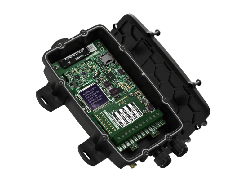 Boîtier ultra-robuste et étanche (IP68 et IK08) avec ventilation GORE®. Conçu pour accueillir la carte PCB, la carte d'E/S et la batterie LiPo rechargeable de 3500 mAh. Comprend 2 presse-étoupes pour permettre l'entrée de câbles étanches dans le boîtier.